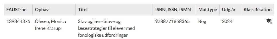 Visning i FBIKat: Poster fra forlægsbasen vises med et ikon af en akademisk hat i højre side. Disse poster kan kopieres direkte til den lokale base.