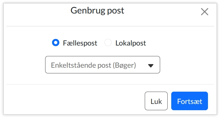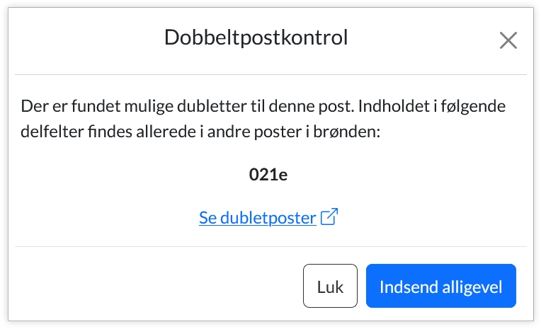 Hvis det viser sig, at din post er en dublet, så vælg Luk og slet din post i kladdeoversigten, hvis du har gemt en kladde undervejs.