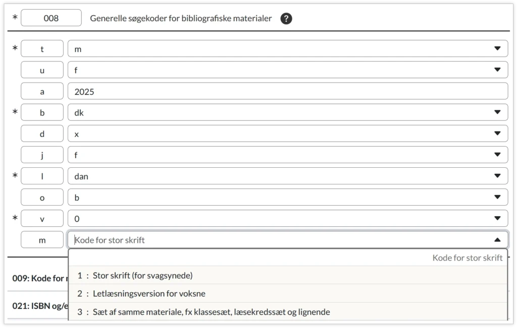 - I felt 008 tilføjes koden for sæt ved at tilføje et delfelt *m med værdien 3