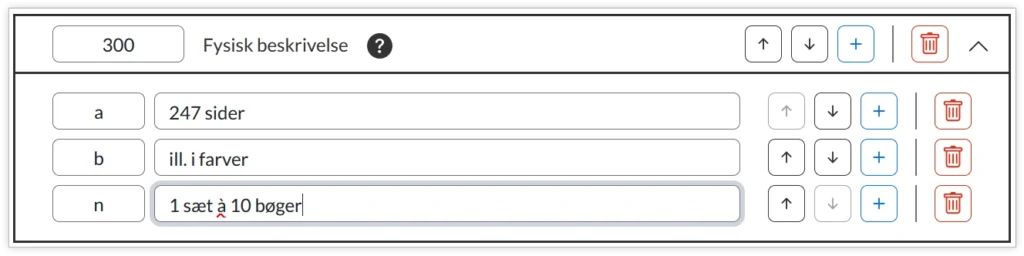 - Tilføj et nyt delfelt *n i felt 300 med værdien for antal bøger, som fx: 1 sæt à 10 bøger