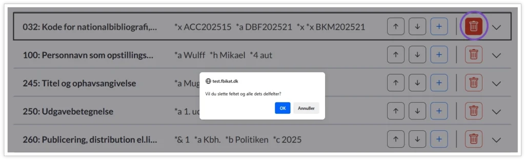 - Slet felt 032 ved at vælge slettesymbolet (skraldespanden) og bekræft at du ønsker at slette hele feltet inklusive delfelter.