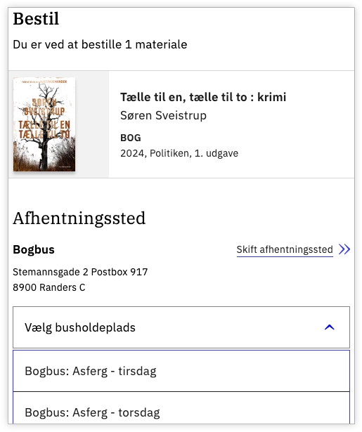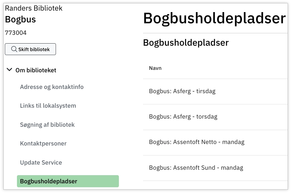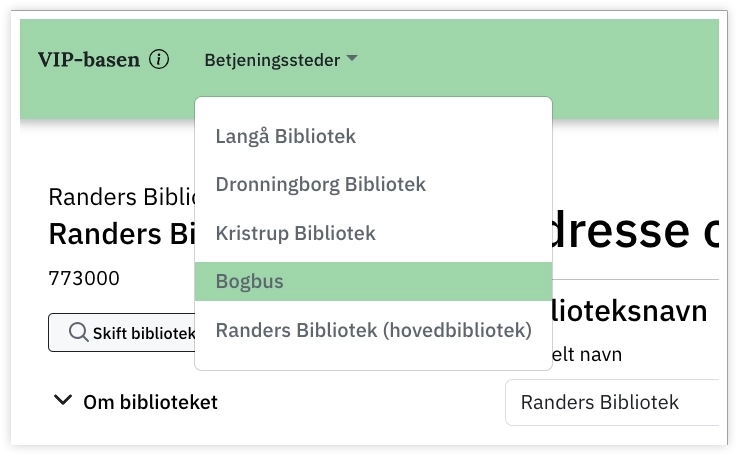 For at redigere information om bogbusholdepladser skal VIP-brugeren først vælge en bogbus i dropdown-menuen Betjeningssted. Når en bogbus er valgt som betjeningssted, optræder der et nyt menupunkt, Bogbusholdepladser under Om biblioteket. Bogbusholdepladser tilføjet her, kan efterfølgende af bibliotekets brugere vælges som Afhentningssted i Bibliotek.dk.