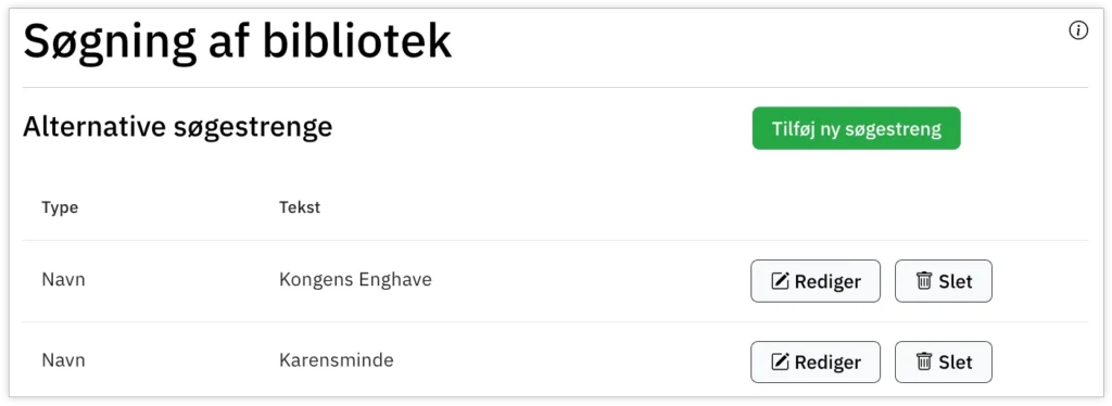 I sektionen Om biblioteket kan biblioteket redigere vejviserinformation, for eksempel adresse- og kontaktoplysninger og åbningstider. Og hvordan bibliotekets navn vises og kan fremsøges i for eksempel Bibliotek.dk.