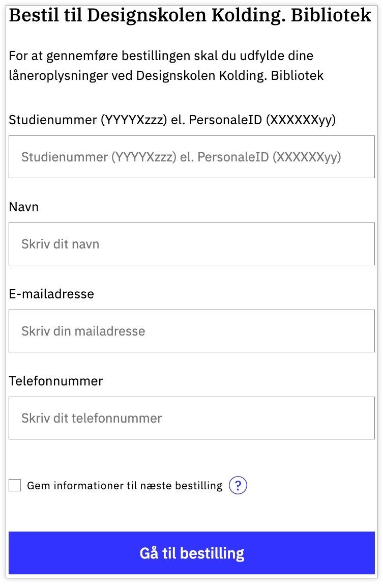 Eksempel på bestilformular, opsat i VIP, for et bibliotek som ikke bruger Bibliotekslogin: