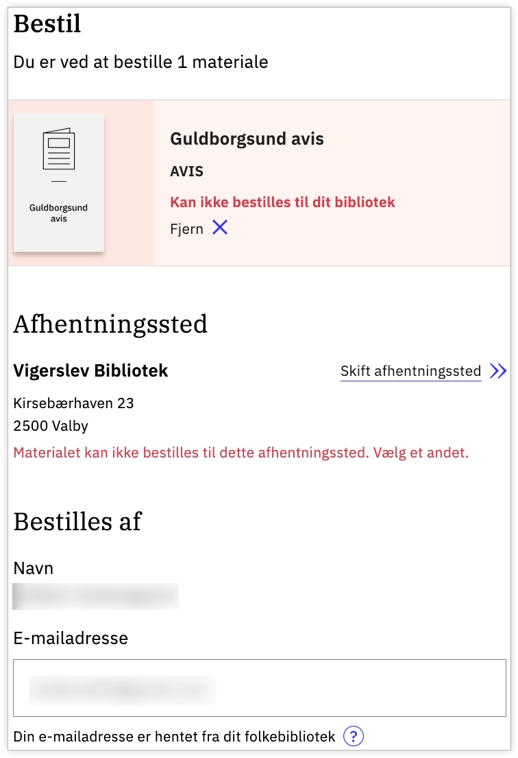 Eksempel på hvordan det ser ud i Bibliotek.dk, hvis bestilling af en bestemt materialetype er fravalgt i VIP: